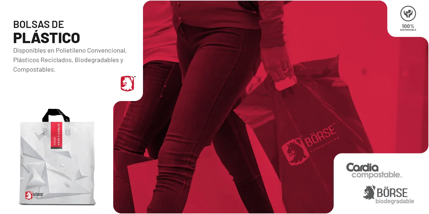 En BÖRSE Handbranding le ofrecemos bolsas de plástico impresas hechas a base de polietileno (PE) de alta, media o baja densidad, plástico reciclado o virgen y también de compuestos plásticos biodegradables y compostables certificados, podemos personalizarlas e imprimirlas con su logotipo, la imagen de sus productos y/o el diseño de su elección. Estas bolsas son sin lugar a dudas la solución ideal para que todo tipo de negocios y empresas puedan empacar y entregar productos a sus clientes en bolsas fabricadas a base de materiales plásticos amigables con el medioambiente.